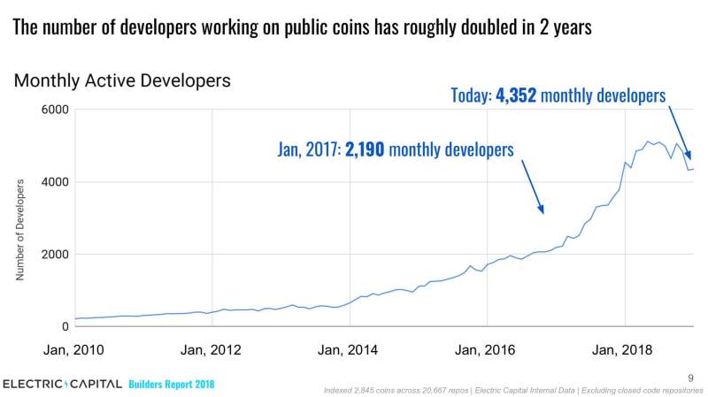 At least that is what a recent study by Electric Capital indicates. The San Francisco-based crypto asset management firm found that the number of developers working on public blockchains doubled since 2017. As of January 2017, there were a total of 2,190 developers working across the public coin projects. That number increased to 4,352 by the end of January 2019. The gap hinted that cryptos’ underlying technologies were being developed at a full-scale despite bearish market conditions.