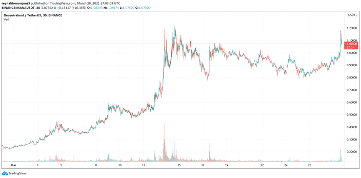 At the time of writing, MANA is trading at $1,06. In the 24-hour chart, the token is showing important gains with 20.6%, as mentioned above. MANA reached an inflection point when it reclaimed the $1,00 area, right after investment firm Grayscale launch their Trust based on this token.