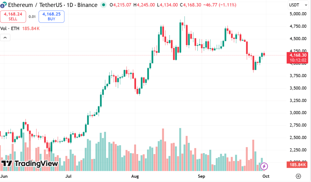 Al momento della stesura, il prezzo di Ethereum è di circa 4.168$, in aumento di oltre il 2% nelle ultime 24 ore, secondo i dati di CoinMarketCap.