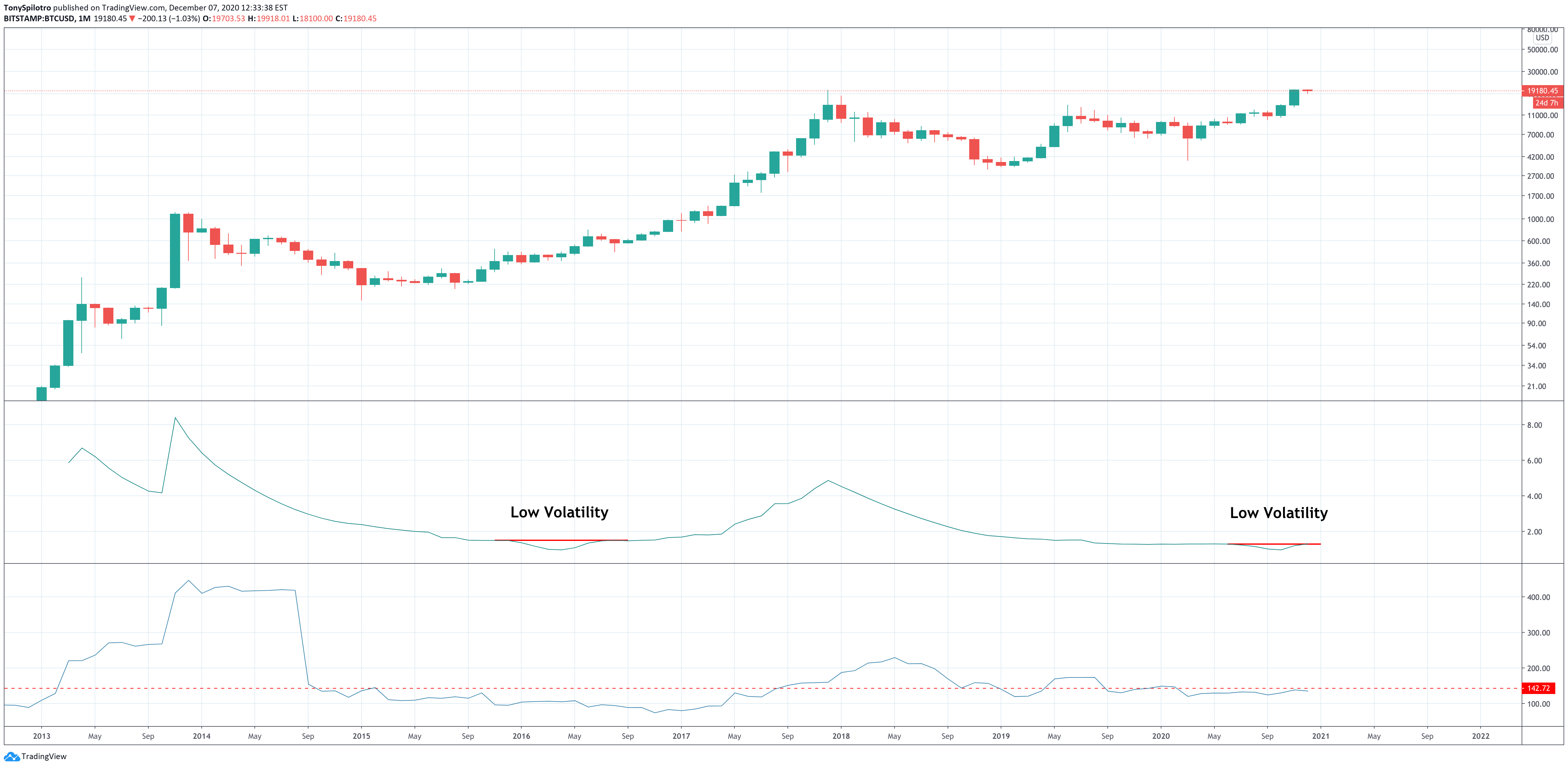 As the definition explains, volatility can move in either direction and doesn’t necessarily mean a drop. Bitcoin is considered one of the most volatile assets in history, yet even though it is testing $20,000, certain tools show volatility is extremely low.