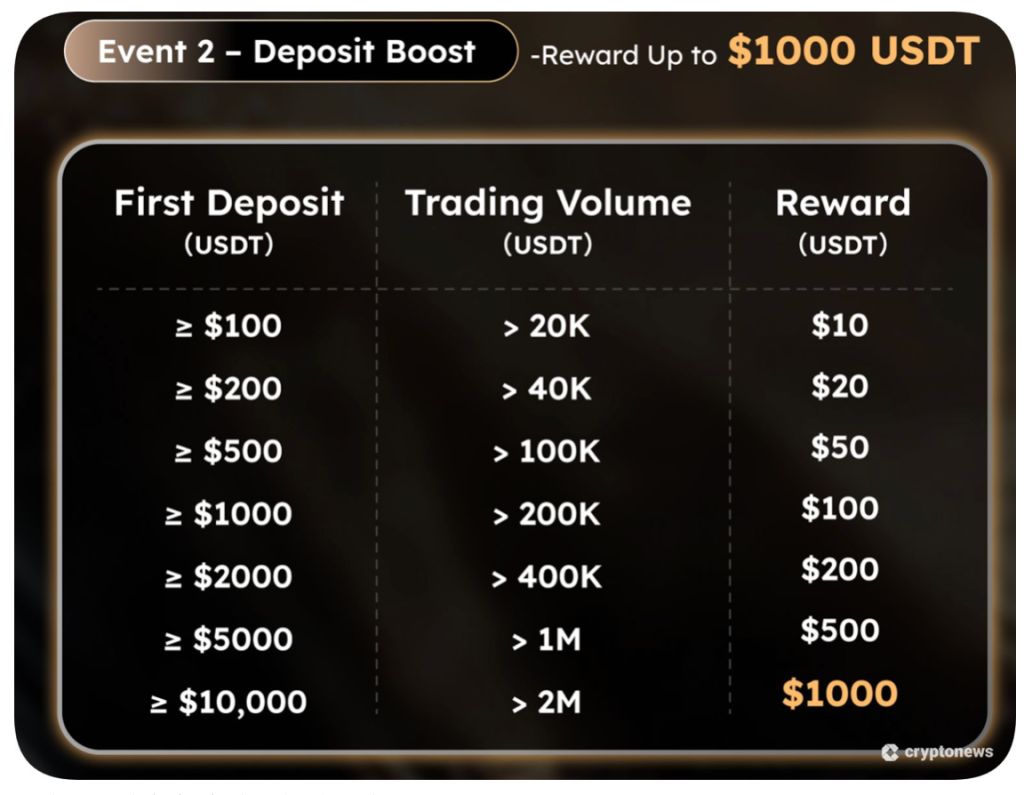 活動設計由三部分組成,包括註冊獎勵、入金加碼與交易返利。使用推薦碼XUCP5K註冊的新用戶,可獲得最高470 USDT的迎新紅利,完成任務後還能進一步解鎖額外獎金。首次鏈上充值將自動觸發10%的入金獎勵,存入的資金越多,紅利越高,獎金將直接發放至期貨帳戶中作為保證金使用。交易回饋部分則採用累進式設計,依照交易量階梯發放,最高可獲得20,000 USDT。