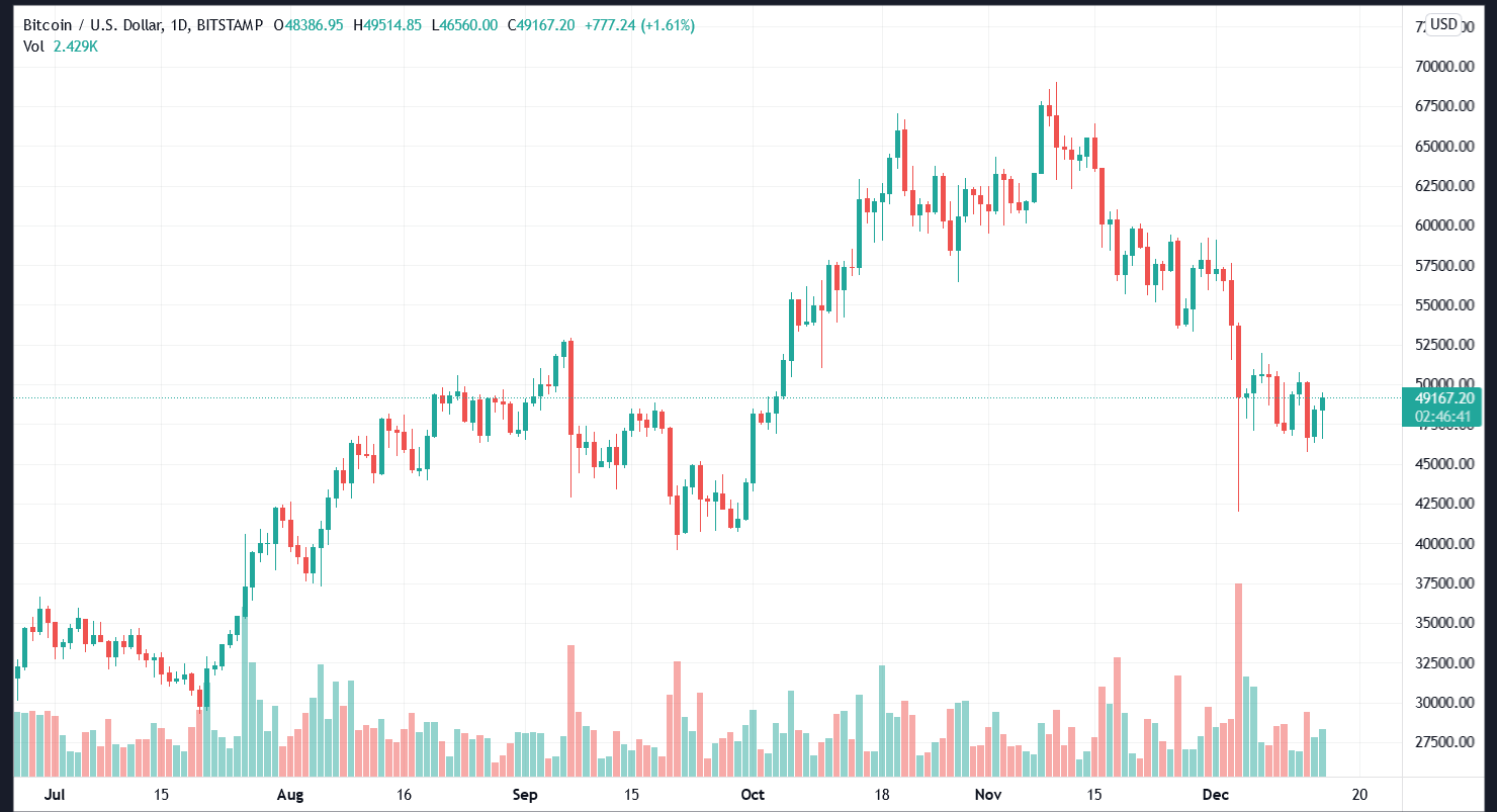 Bitcoin was expected to exceed $100,000 by the end of 2021, according to Jesse Powell. Despite the fact that he stated that there are still a few days left, at a press time price of $49,396, and given the present trend, a milestone as significant as the one promised is unlikely to occur.