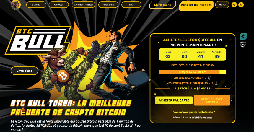 Lancé en prévente il y a seulement quelques jours, le projet BTC Bull a déjà atteint le seuil symbolique du million de dollars. En investissant sur BTC Bull, vous pourrez aussi recevoir des airdrops en Bitcoin. Pour cela, il faudra que l’actif numéro 1 au monde atteigne certains seuils. Au seuil des 150 000 dollars, les holders du $BTCBULL recevront ainsi du $BTC.