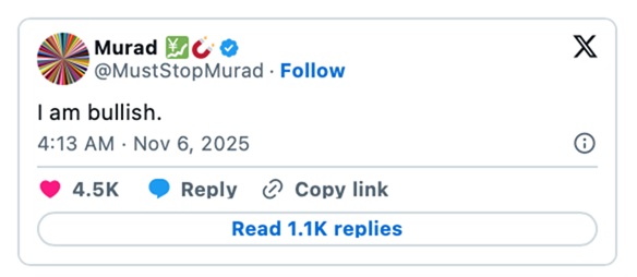 在整體情緒低迷的背景下,最受尊敬的迷因幣支持者之一 Murad Mahmudov 再次以一句簡短的 X(原推特)發文,堅定表達了他的信心:“I am bullish.”(“我看漲。”)