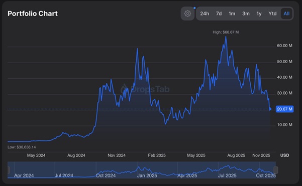 在 2024 年首次提出「迷因幣超級週期」這一概念的人,如今已經以精准捕捉市場拐點而聞名。根據鏈上資料追蹤平臺 DropsTab 的統計,Murad 目前仍持有約 1920 萬美元的未實現收益——儘管他的整體持倉 年內已回撤約 40%。