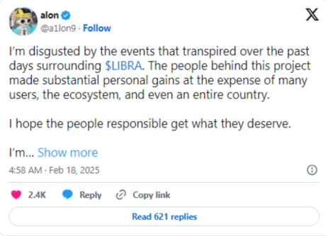 Алон, глава платформы Pump.fun, раскритиковал ситуацию с $LIBRA и призвал к усилению мер защиты трейдеров.