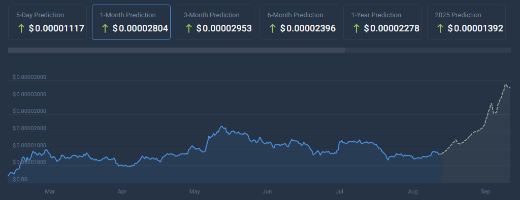 According to crypto price prediction platform CoinCodex, PEPE is going to surge upward by 226%, which takes PEPE price to $0.00002804 by September 26, 2024. These are very bullish forecast helped along by analyses that indicate PEPE could be signaling a “humongous” breakout, according to crypto analyst The Crypto Titan.
