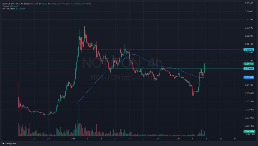 Notcoin has shown strong performance despite the recent slowdown in the market. Over the weekend, the token started to recover from last week’s retrace, going from trading at $0.0094 to hovering between the $0.015-$0.017 price range.