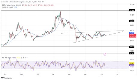 The 4-hour relative strength index is signaling that the price of DOT might break below the lower base of the wedge as the RSI line is seen trending a bit below the 50% level. From this RSI formation, it can be suggested that if DOT breaks below the wedge, it will begin to move downward toward the closest key support level.