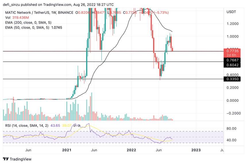 MATIC is currently trading at $0.77, just below the 50 and 200 Exponential Moving Average (EMA), which corresponds to prices of $0.82 and $1, acting as resistances for MATIC price.