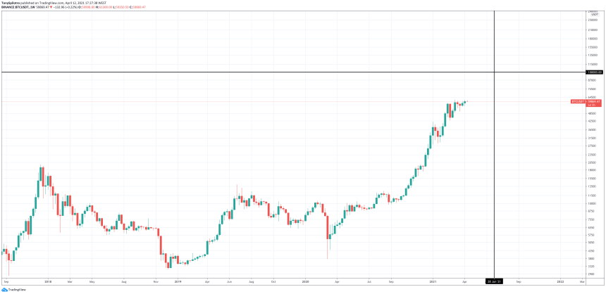 Bitcoin price must maintain comparable momentum over the last year to keep climbing at a similar rate and reach more than $100K per coin. The number is now closer to the current price action than $10K is, and thus potentially more achievable.