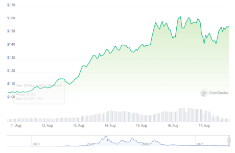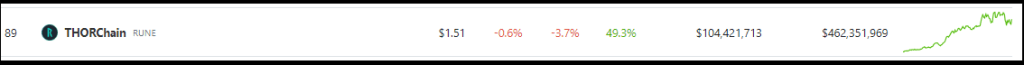According to statistics from Coingecko, THORChain is currently priced at $1.54, reflecting an increase of 50% over the past seven days. However, it has had a decline of 3.7% within the last 24 hours.