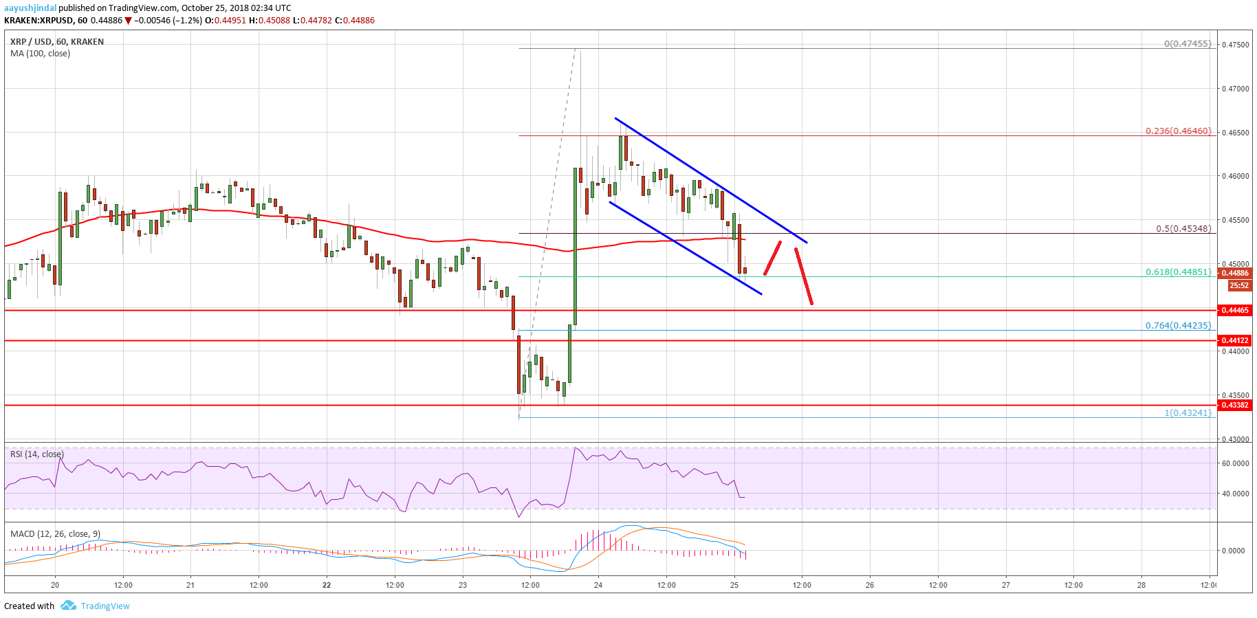 It is currently trading well below the $0.4600 level and the 100 hourly simple moving average. More importantly, there is a short term declining channel in place with resistance at $0.4540 on the hourly chart of the XRP/USD pair. An immediate support is the 61.8% Fib retracement level of the last wave from the $0.4324 low to $0.4745 high at $0.4480. Below this, the price could test the next key supports near the $0.4460 and $0.4425 levels in the near term. On the upside, a break above the $0.4540 and $0.4600 resistances may open the doors for a fresh upside.