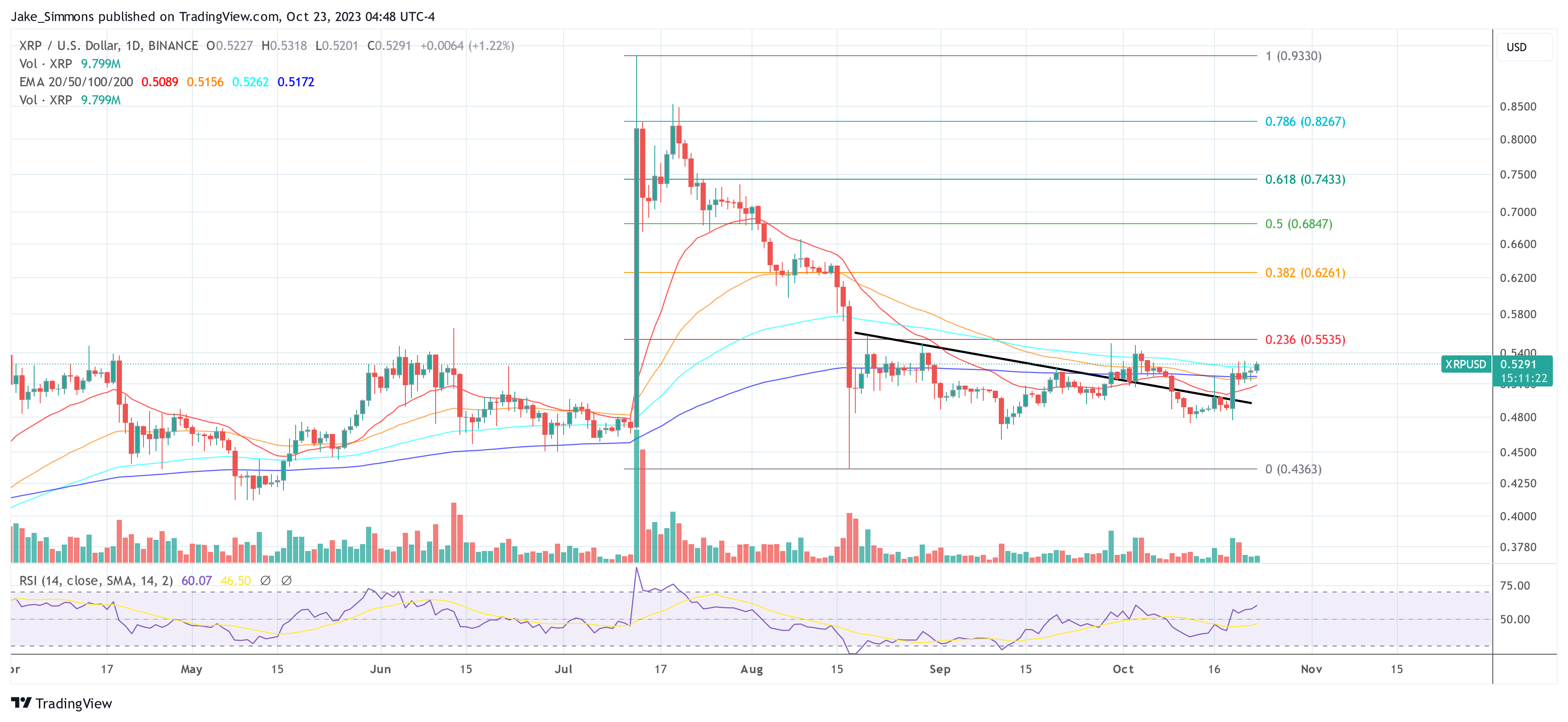 Currently, the XRP price sits at around $0.52. As the analyst shows in the chart, XRP has experienced a retest of the trend line and passed it with flying colors. In particular, Egrag also points out that XRP was able to stay above the 0.236 Fibonacci retracement level at $0.4534.