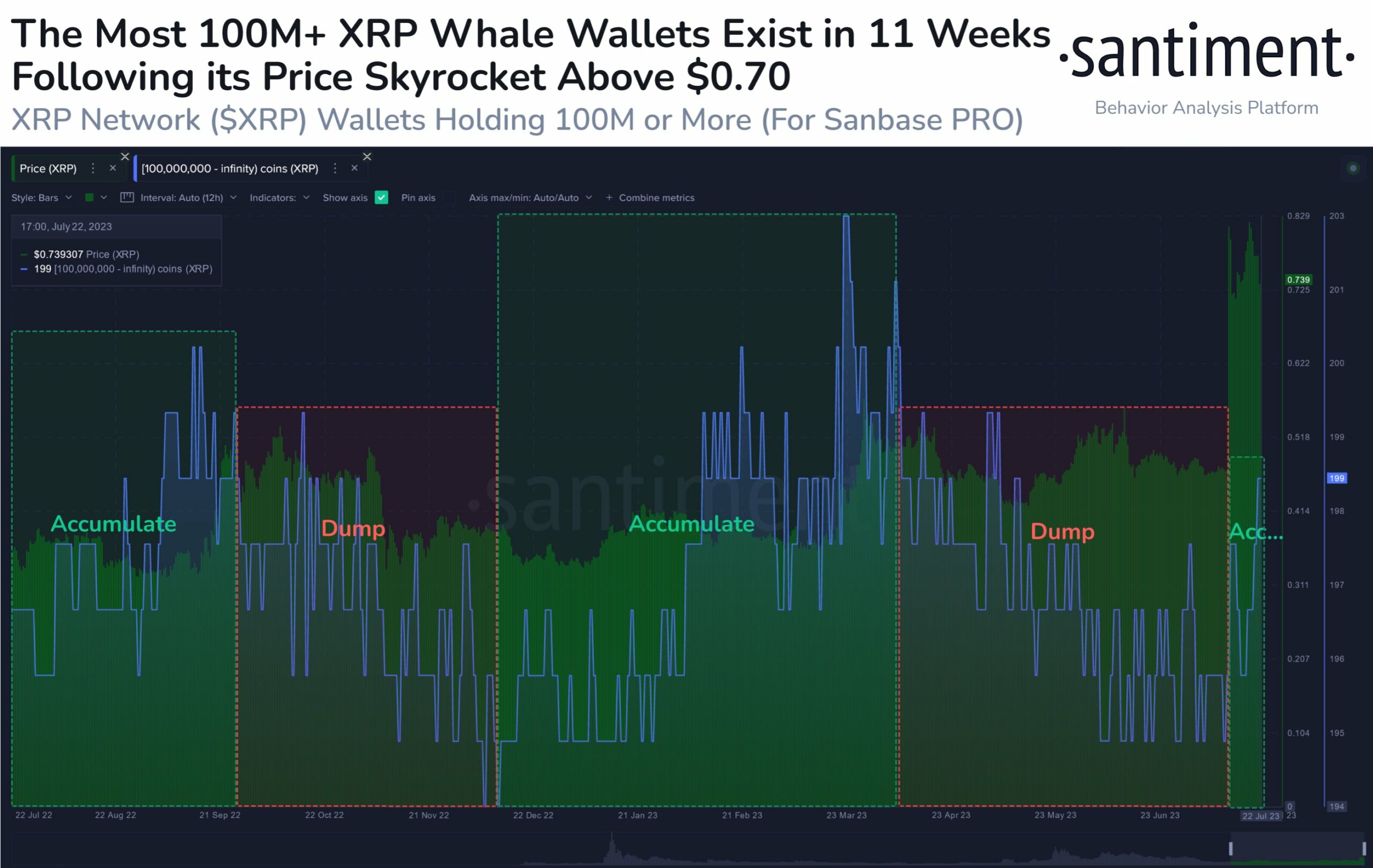 According to an on-chain data analysis by Santiment, a leading market intelligence platform, the number of whale wallets holding a substantial 100 million or more XRP has witnessed a significant increase recently, now standing at an impressive 199. These whales, each commanding a minimum value of $74 million, have been closely observed over the past year, exhibiting strategic buying and selling patterns that impact XRP’s price movements.