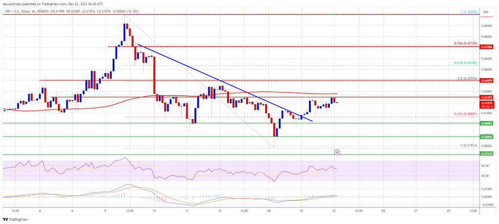 If XRP fails to clear the $0.630 resistance zone, it could start a fresh decline. Initial support on the downside is near the $0.606 zone.