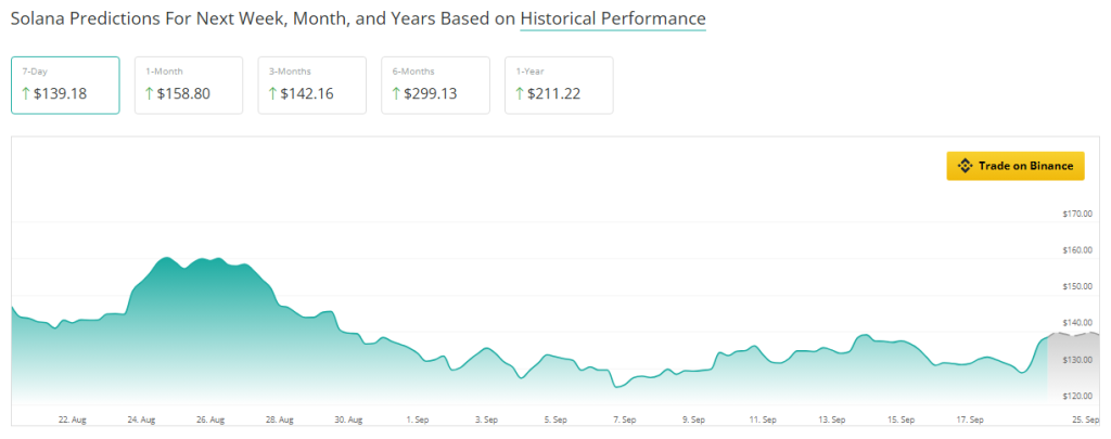 In six months, Solana’s price could surge by 115%, with a 52% increase projected over the next year. This indicates that though the short-term future is not so promising, Solana is a big investment prospect in the long-run.