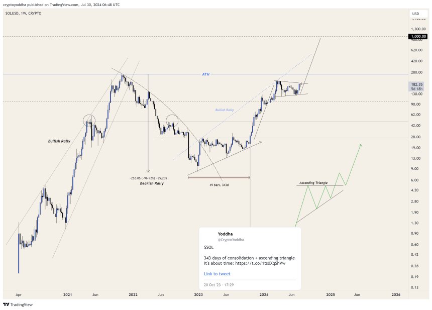 This period was followed by a 600% surge to the yearly high above $200 seen in March. According to Yhodda, SOL is in an accumulation zone again, moving within a falling wedge pattern. The chart suggests to the trader that the token’s price could skyrocket over 455% in the coming months, hitting the $1,000 mark this bullish run.