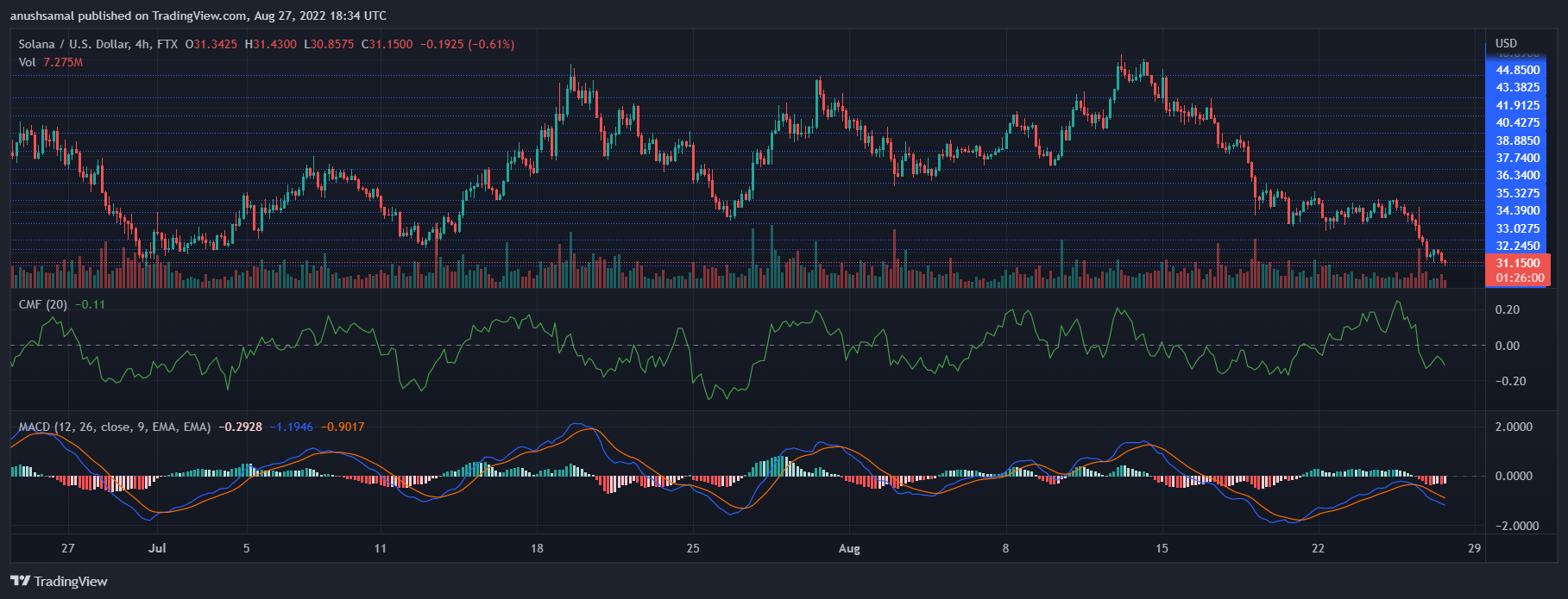 SOL was trading for $31 at the time of writing. The coin just lost the support of the $34 level and was eyeing the next support level.