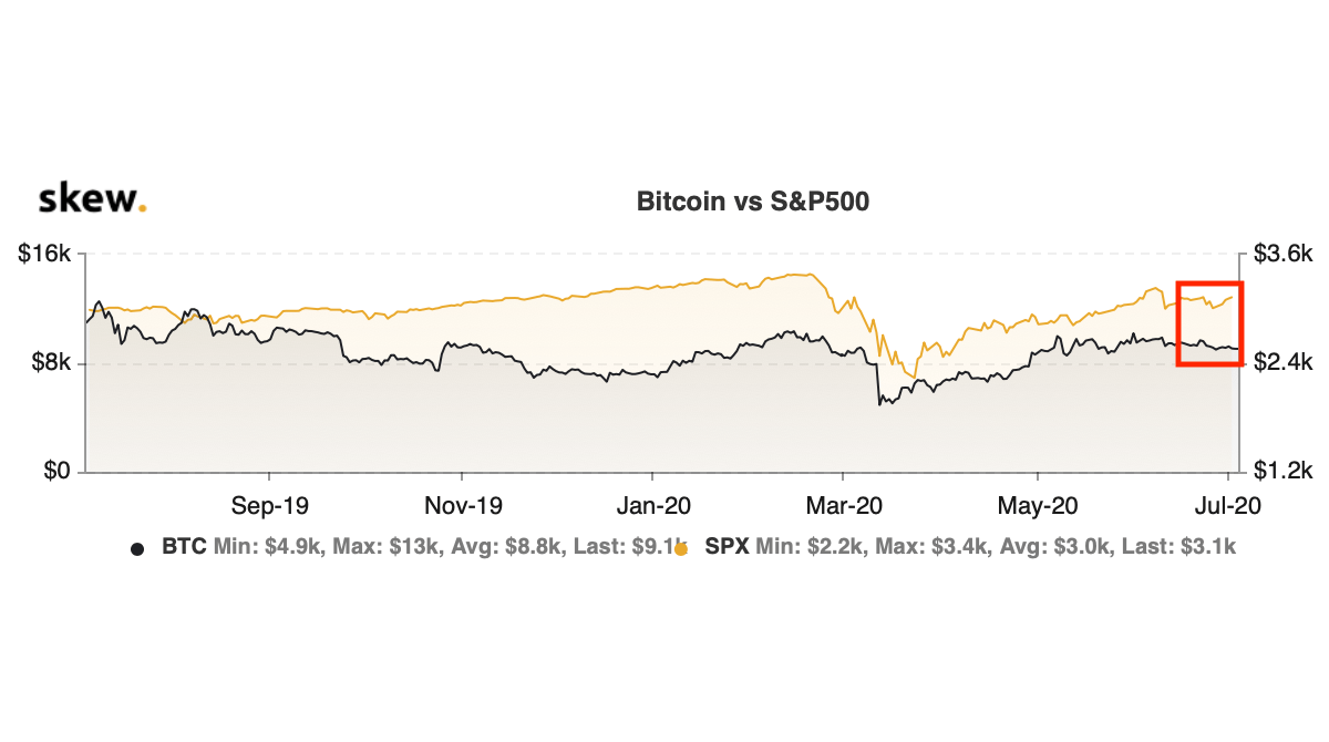 This correlation, however, is beginning to show some signs of breaking as the stock market recovers while Bitcoin continues trading sideways around $9,100, a trend that can be clearly seen on the below chart from Skew.