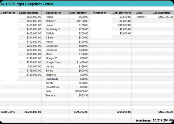 As I promised in Sunday’s tweet regarding Sushi’s Budget Snapshot for 2023, I am making the DAO operating costs public. Transparency is a critical component of a successful DAO. You can see most budget costs are salaries. 1/ pic.twitter.com/rVHXEJSfLR