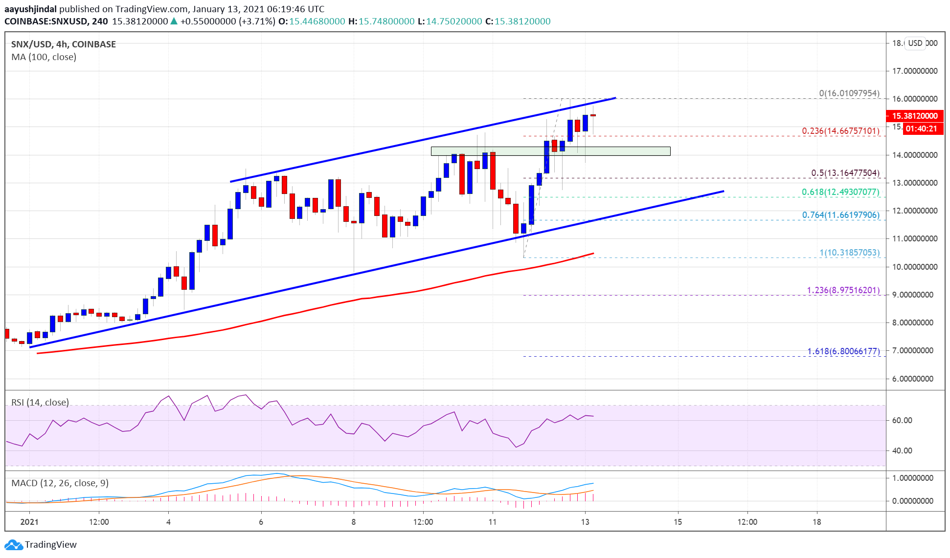 Synthetix (SNX) remained in a bullish zone above $15.00, despite pullbacks in bitcoin and ethereum against the US Dollar. SNX price is likely to rally towards $20.00 if it clears the $16.00 hurdle.