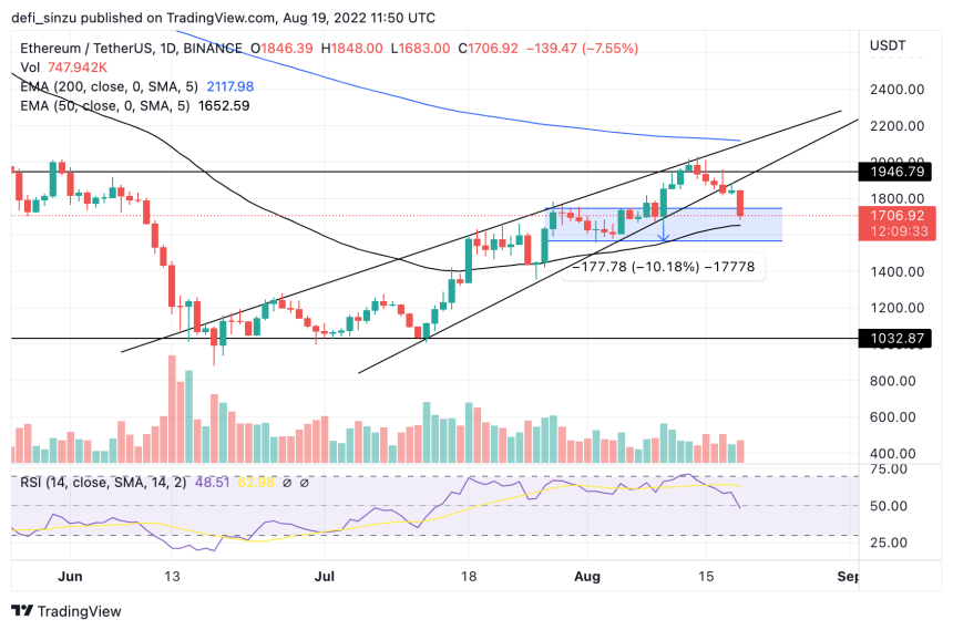 ETH needs to hold above this support area that corresponds with the 50 EMA, a break below this region could send the price of ETH to $1,400.