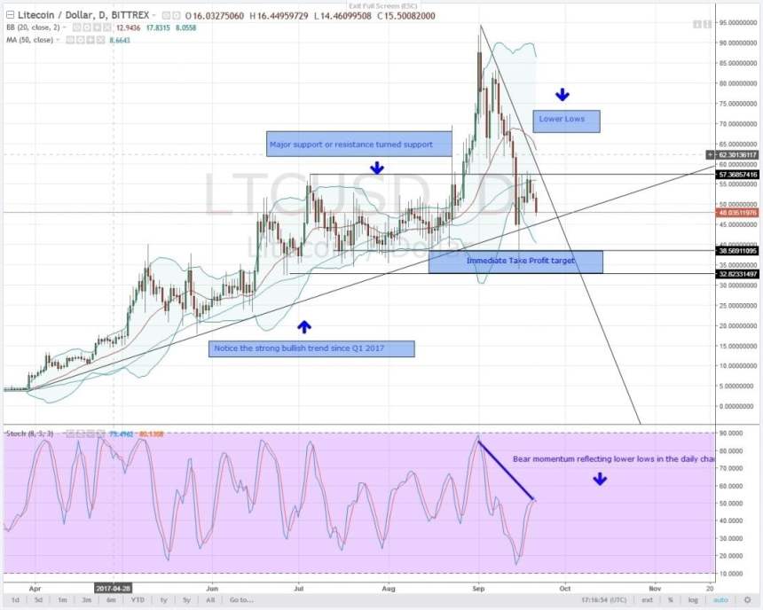 If all things are kept constant, key resistance trend lines have remained intact. As a major characteristic, most altcoin pairs turned lower after beginning September 2017. Since then it has been a one-way traffic towards major support zones. There was a bear crossover between the 20 and 50 period moving averages after 16.09.2017 signaling bears. Also, the 50-period moving-average, in particular, is acting as a boundary and resistance zone alongside the major resistance trend line. Sellers should hold their positions and wait for a support retest between 0.24-0.39