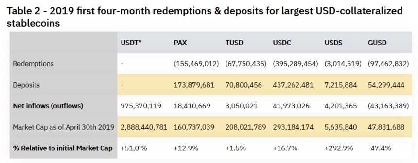 “Though Tether’s market cap is much bigger than the cumulative market capitalization of all five other stablecoins discussed in the table above [USDC, TUSD, PAX, USDS, GUSD], these inflows still represent an increase of around 50% of Tether’s total supply, particularly notable in a period of turmoil for the company.”