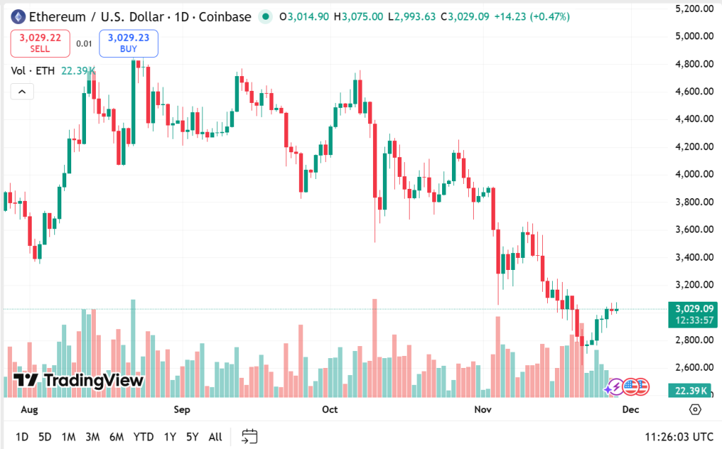Dopo essere sceso fino a 2.600 dollari durante l’ultima correzione, Ethereum ha mostrato maggiore resilienza rispetto ad altri asset, recuperando rapidamente area 3.000. Pur non essendo ancora un segnale di breakout, questa stabilizzazione potrebbe favorire un rimbalzo più solido qualora i flussi verso gli ETF tornassero ad aumentare nelle settimane finali dell’anno.