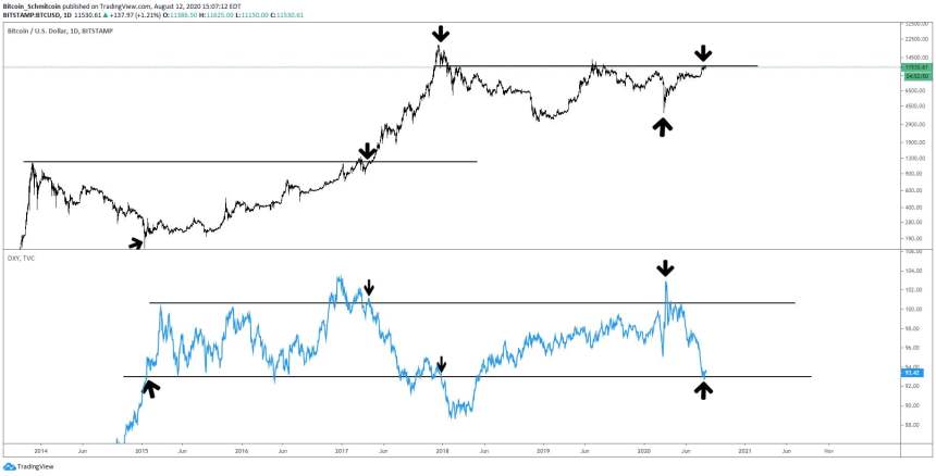 According to a chart shared by a prominent Bitcoin analyst, ebbs and flows in the dollar have directly correlated to strength and weakness in Bitcoin. For example, the last time DXY traded at these levels, the cryptocurrency was trading at nearly $20,000.
