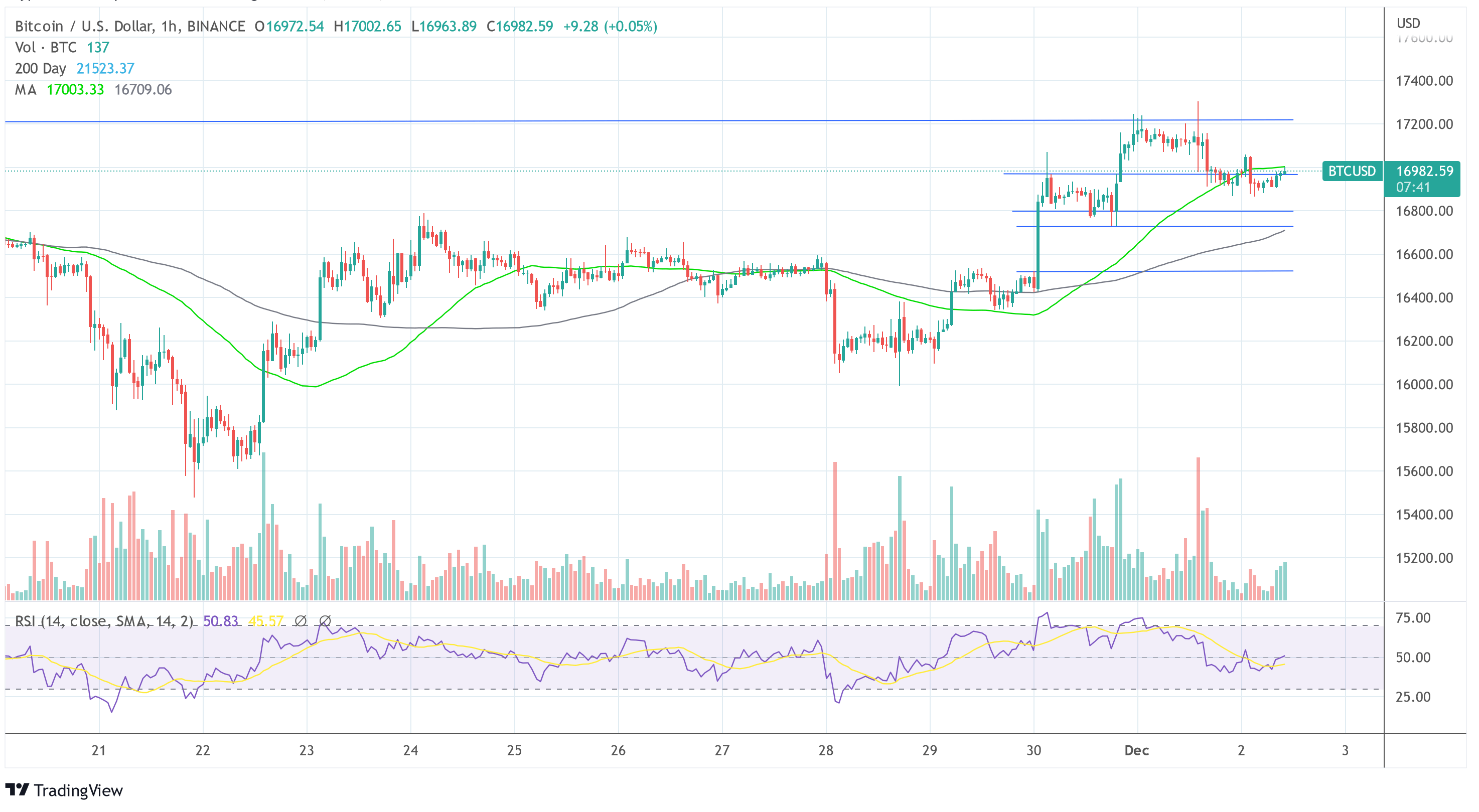In the 1-hour chart, investors should keep an eye on four levels. A fall below $16,727 could mean an erosion of the recent Powell gains. On the other side, a rise above the $17,250 level would clear the path towards the $17,800-$18,000 area.