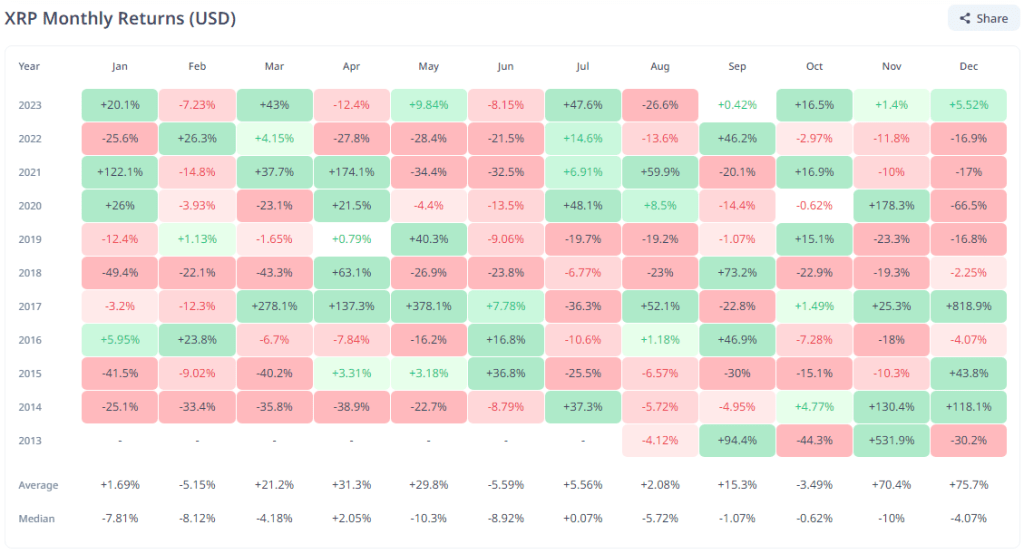 Each one shows a year of loses at the end of the year. In the middle of this cold landscape, though, sits a defiant evergreen: 2017. Its shimmering 818% gains serve as a reminder of XRP’s hidden potential.