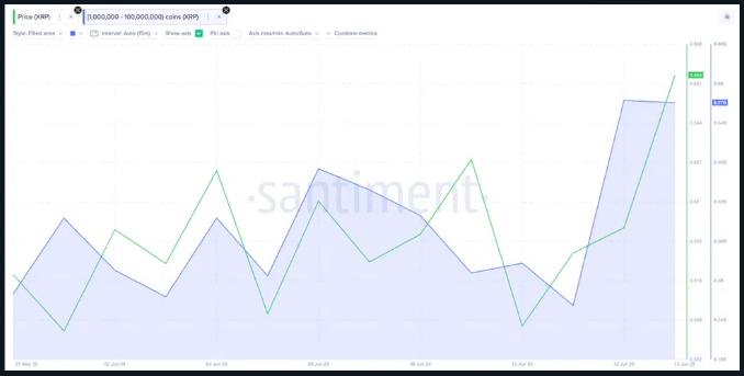 Below is a chart from Santiment showing the 310 million new XRP that crypto whales with 1–100 million in their holdings bought between June 10–13.