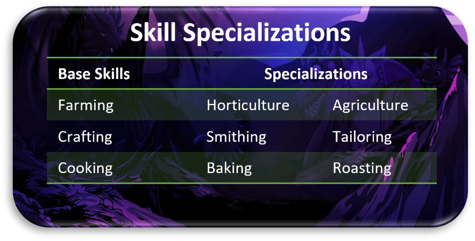 The dragons can increase in Skill Levels by performing tasks. As experience increases through skill-specific actions, useful higher-tier items unlock that assist in completing more complex tasks. A specialization skill can be chosen when the “Experienced” level is reached in a skill. Each base skill has two specializations, and only one skill from each base skill can be chosen to specialize.