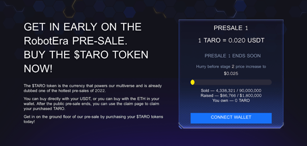 The TARO token is an ERC-20 token, with its presale scheduled for Q4 2022. The presale has been allocated 90 million TARO, with 1 TARO being worth 0.020 USDT in the first stage, which will increase to $0.025 in the second stage. TARO can be purchased with USDT or ETH. The minimum investment is 1,000 TARO, which is $20.