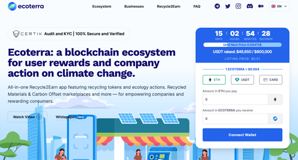 Ecoterra stands apart in the green market by acknowledging our need for rewards and recognition. It will play a key role in boosting participation in environmental initiatives in the coming years. Ecoterra is one of the most promising crypto tokens to buy in 2023. The best way into the project is the ongoing Ecoterra presale, which comes with early-stage discounts.