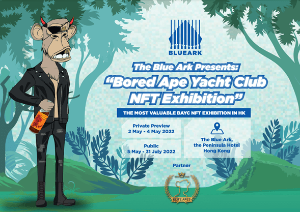 BlueArk is collaborating with Elite Apes as well as other local NFT collectors to curate the first Bored Ape Yacht Club exhibition in Hong Kong. It will be held at The BlueArk in Tsim Sha Tsui’s Peninsula Hotel from the 5th May to 31st July 2022.