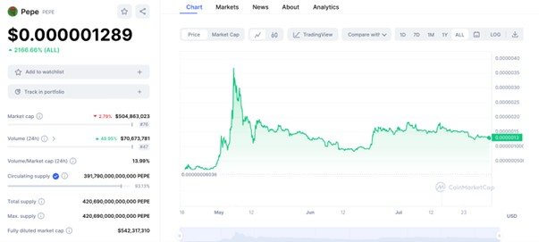 Pepe 1-month price action, 31 July 2023, CoinMarketCap