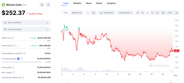 Bitcoin Cash 1-month price action, 31 July 2023, CoinMarketCap