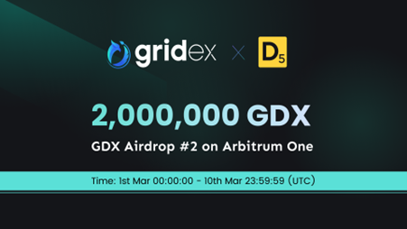 Gridex Protocol, the fully on-chain order book trading protocol, kicked off the second round airdrop of its native token GDX on March 1 to celebrate its launch on the layer-2 Ethereum chain Arbitrum. The airdrop was launched in partnership with D5 Exchange, the first aggregator combining the power of Order Books and AMMs, providing a revolutionary on-chain trading experience. As a result of the airdrop, D5 Exchange’s ETH/USDC trading pair alone reported a spectacular trading volume of over $10,000,000 USD on the airdrop’s first day.