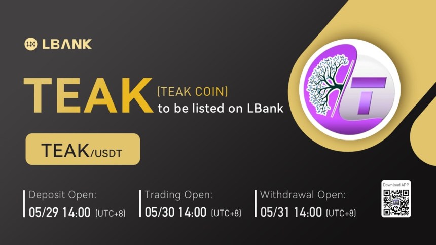INTERNET CITY, DUBAI, May. 26, 2022 – LBank Exchange, a global digital asset trading platform, will list TEAK COIN (TEAK) on May 30, 2022. For all users of LBank Exchange, the TEAK/USDT trading pair will be officially available for trading at 14:00 (UTC+8) on May 30, 2022.