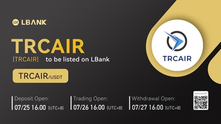 INTERNET CITY, DUBAI, Jul. 25, 2022 – LBank Exchange, a global digital asset trading platform, will list TRCAIR on July 26, 2022. For all users of LBank Exchange, the TRCAIR/USDT trading pair will be officially available for trading at 16:00 (UTC+8) on July 26, 2022.