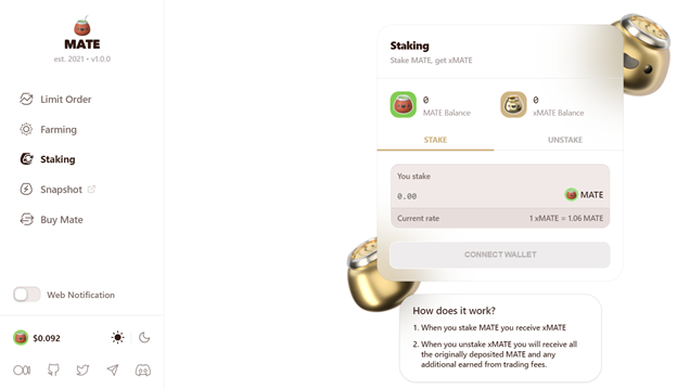 Mate is a DEX designed to combat slippage and high liquidity while giving its traders the best exchange rates on all BSC assets. Besides limit orders, they also have liquidity pools and various staking options.
