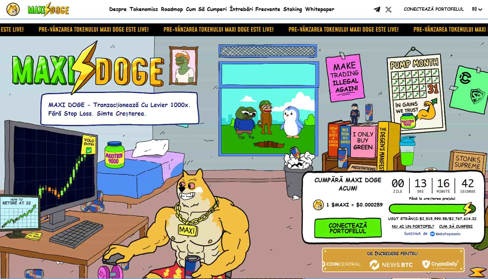 Tokenomics-ul reflectă această strategie: o mare parte din fonduri este direcționată către marketing, lichiditate și dezvoltare, pentru a menține vizibilitatea și atracția în rândul investitorilor. Maxi Doge mizează pe impulsul social și pe „pump”-uri rapide, ceea ce îl face atractiv pentru investitori orientați spre câștiguri pe termen scurt – însă și expunerea la risc este foarte ridicată.
