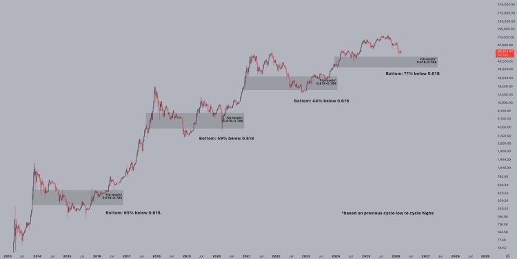 Crypto analyst Jelle shared a chart that puts things in perspective. The Bitcoin price prediction based on historical patterns tells a pretty clear story: bear markets always bottom well below the 0.618 retracement level.