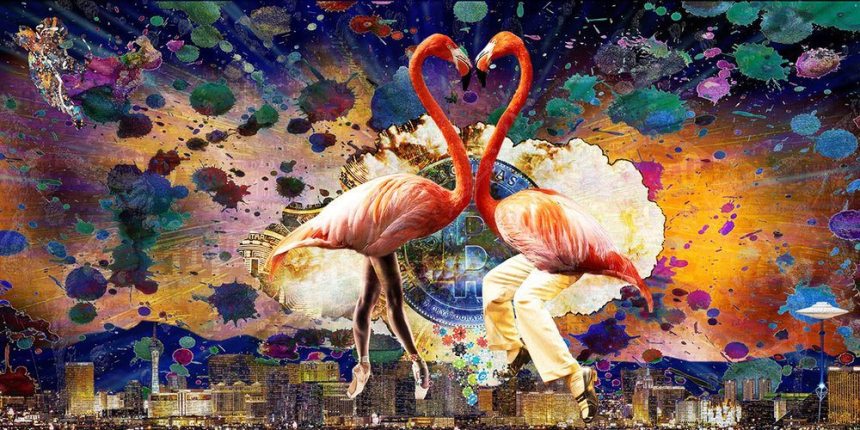 The Flamingo hotel is a big part of the birth story as well as falling in love so the central birds are a tribute to that. Nuclear weapons used to be tested about 40 miles off the strip for a long time so this time the explosion is crypto becoming a part of casino operations as well as funding for art performances and strip clubs.