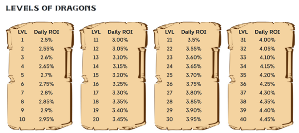 Dragon can grow up to the 40th level and bring income up to 1625% APY in BNB.