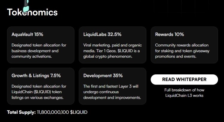 LiquidChain has a fixed total supply of 11,800,000,100 $LIQUID tokens. The largest share goes to development at 35%, ensuring continuous improvements to the Layer-3 network, followed by 32.5% allocated to LiquidLabs for global marketing and ecosystem expansion. The remaining supply is distributed across AquaVault at 15% for business development and community initiatives, 10% for staking and community rewards, and 7.5% reserved for growth and exchange listings.