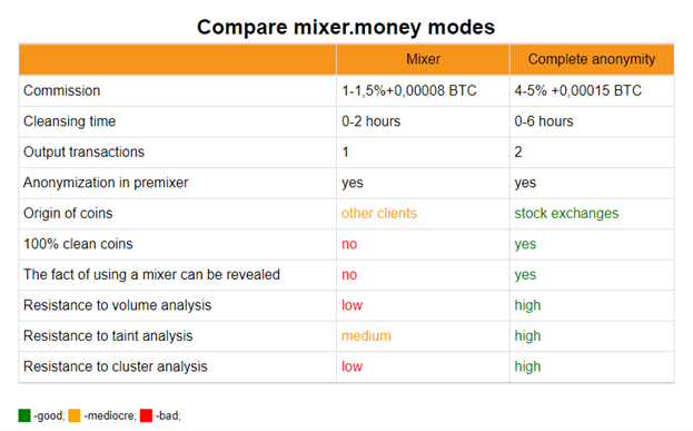 This is a simple mode with quick mixing and low fees. A customer deposits bitcoins as described above, the coins are anonymized and sent to the exchange. The customer then receives already clean coins from other customers using the ‘complete anonymity’ mode.